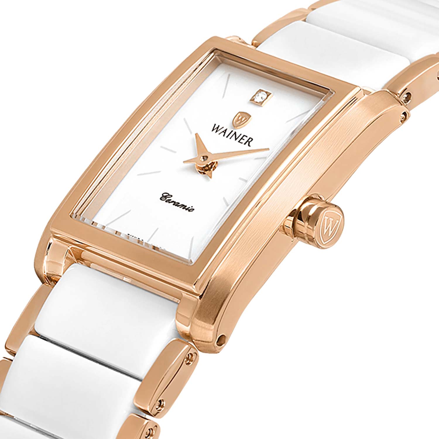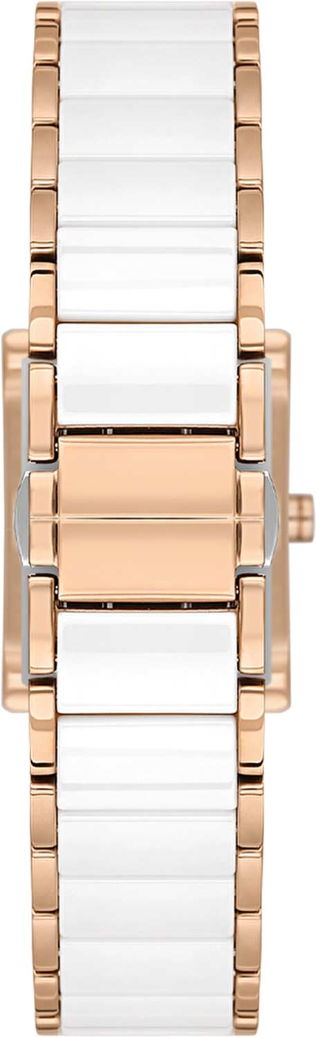 Корпус и браслет выполнены из нержавеющей стали с элементами высокотехнологичной керамики белого цвета, что придает часам изысканный вид и долговечность. Минималистичный белый циферблат с часовыми метками и стальными стрелками с PVD покрытием обеспечивает легкую читаемость времени без лишних деталей. Раскладывающаяся застежка-клипса гарантирует удобство и надежную фиксацию на запястье.