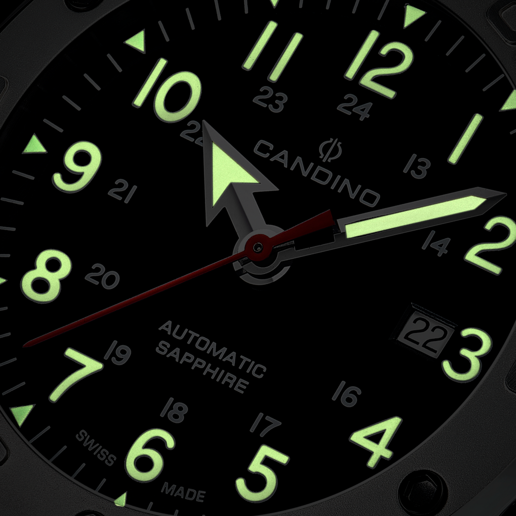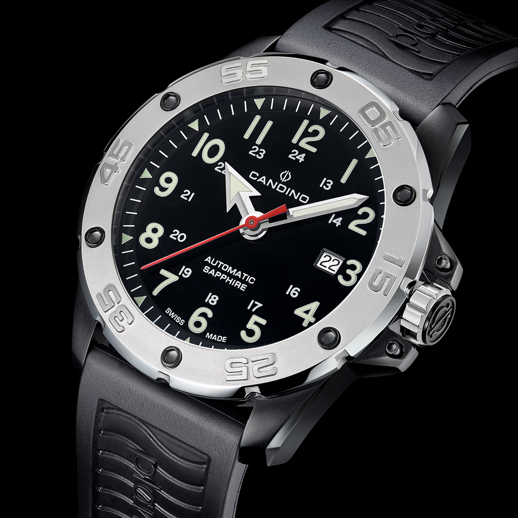 Сапфировое стекло гарантирует высокую устойчивость к царапинам и сохраняет циферблат в идеальном состоянии даже при интенсивном использовании. Черный циферблат с арабскими цифрами, покрытыми люминесцентным составом Super-LumiNova, обеспечивает отличную читаемость в любое время суток, а стрелки с таким же покрытием дополняют функциональность. Каучуковый ремешок черного цвета с классической пряжкой обеспечивает комфортную посадку на запястье и надежную фиксацию, что особенно важно во время физической активности.